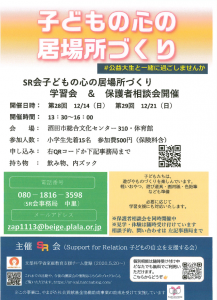 SR会(Support for Relation子どもの自立を支援する会)より「子どもの心の居場所づくり 学習会&保護者相談会 」のお知らせ