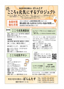 「生きる」~こころをかるくするための8つの方法~ 3月の「自殺対策強化月間」のプログラムとして今年も開催します。ゲストスピーカーに青森いのちの電話理事長藤林正雄さん他をお迎えし、それそれの日常の中での「生きる」をテーマにお話します。参加の皆さまとこころをかるくするための「ヒント」を探します。