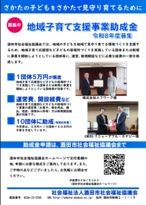 酒田市社会福祉協議会では、地域の子どもを地域で見守り育てる環境づくりを支援するため、地域子育て応援団など子どもの居場所づくりを実施している団体または新規に事業を開始しようとしている団体等に、運営、新規開設などに必要な経費の一部を助成します。(子ども食堂は対象外)
